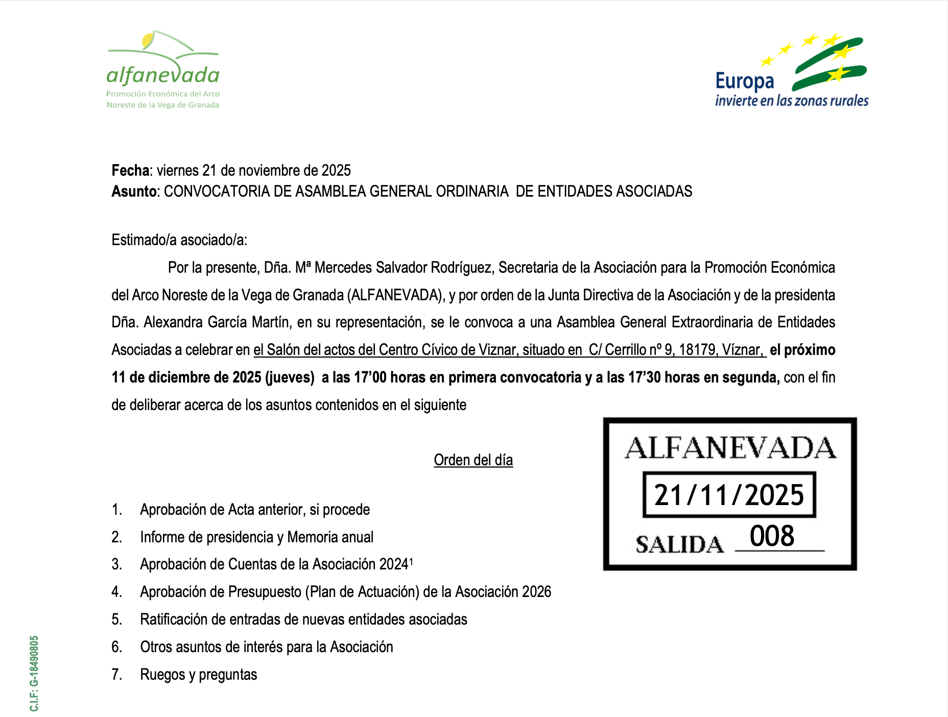 Se le convoca a una Asamblea General Extraordinaria de Entidades Asociadas a celebrar en el Salón del actos del Centro Cívico de Viznar, situado en C/ Cerrillo nº 9, 18179, Víznar, el próximo 11 de diciembre de 2025 (jueves) a las 17’00 horas en primera convocatoria y a las 17’30 horas en segunda.