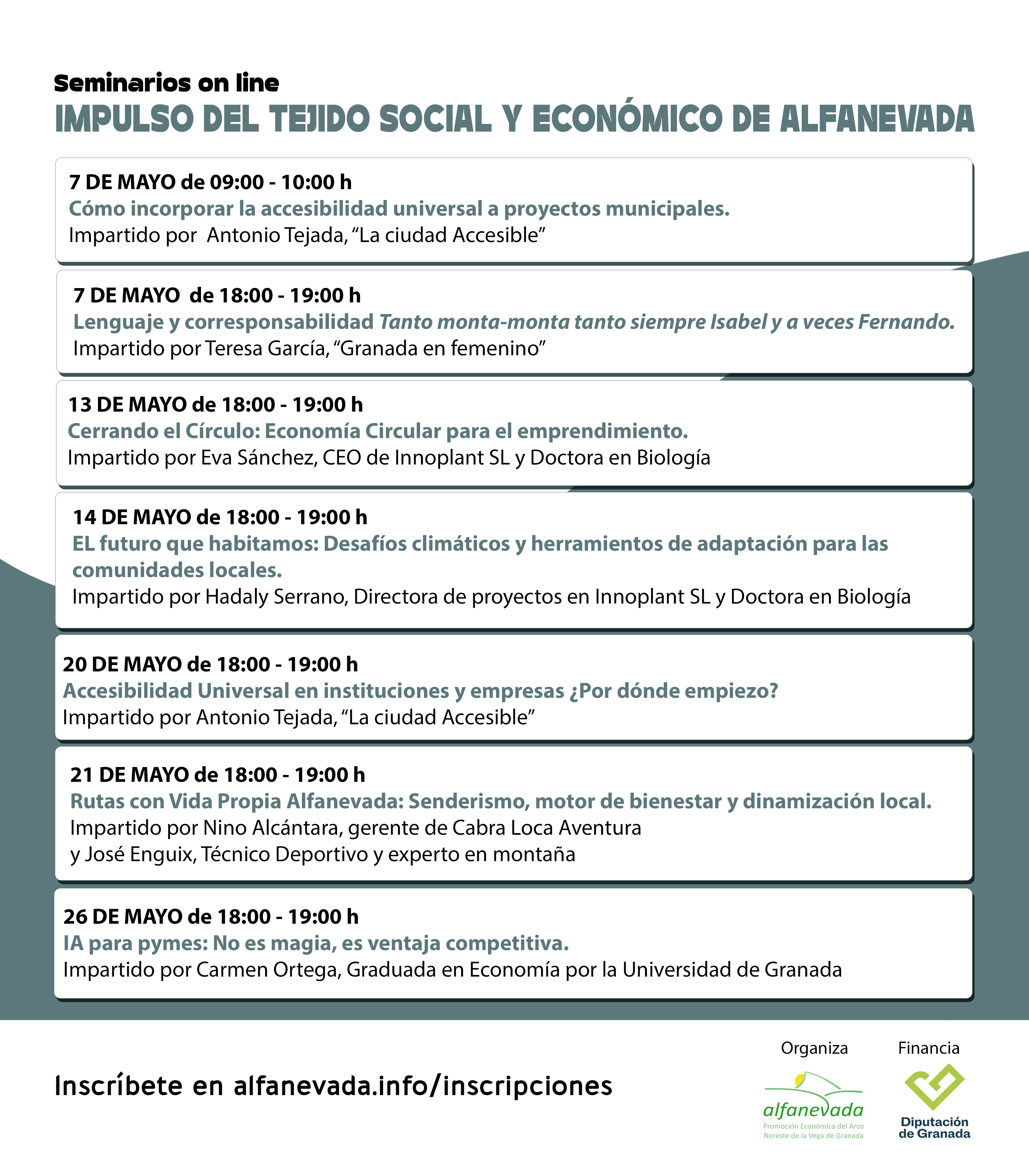 Alfanevada pone en marcha un nuevo ciclo de seminarios online gratuitos con el objetivo de reforzar el tejido social y económico del territorio. Esta iniciativa, financiada por la Diputación de Granada, se desarrollará entre el 7 y el 26 de mayo de 2026 y abordará cuestiones clave como la accesibilidad, la igualdad, la sostenibilidad, el emprendimiento o la transformación digital.